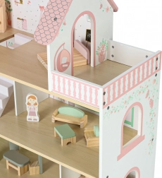 Vzdržljiva konstrukcija iz MDF plošč, gladki robovi in stabilna izdelava zagotavljajo varno igro. Hišica je visoka 70 cm, zato je idealna za skupno igro sorojencev. Odpirajoča se omarica, premični dodatki in dve leseni figurici spodbujajo domiselne zgodbe ter razvoj fine motorike.