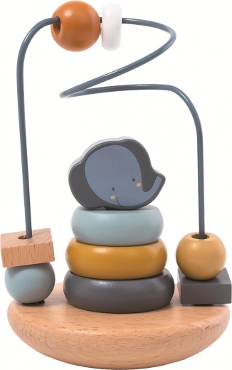 Labirint z biserčki in slonom uri koordinacijo oko–roka in prijem, mavrični loki pa pomagajo razvrščati po velikosti in graditi ustvarjalne oblike.