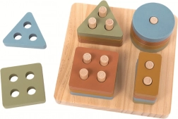 Ta kakovostna lesena natikajoča igra ponuja štiri osnovne oblike – kvadrat, trikotnik, krog in pravokotnik – v prijetnih barvah. Vsaka oblika ima različno število lukenj, kar otrokom pomaga razumeti princip razvrščanja in logičnega razmišljanja. Pri natikanju koščkov na količke otroci naravno urijo prijem, natančnost gibov in osredotočenost.