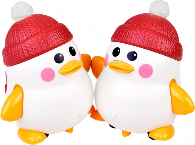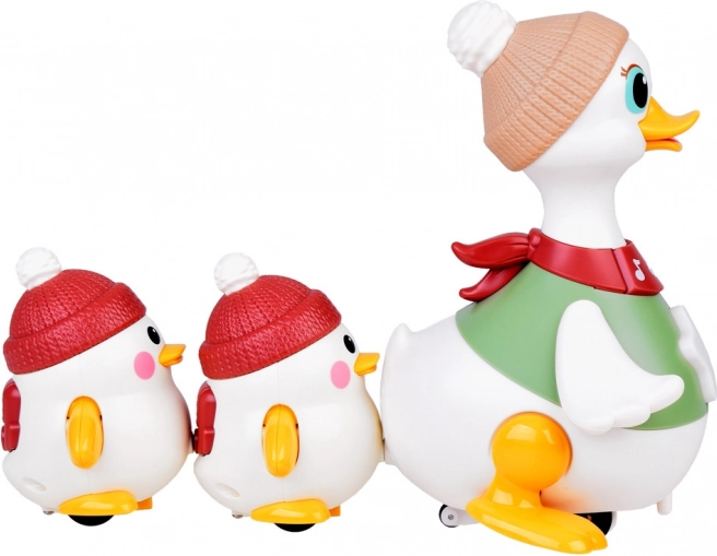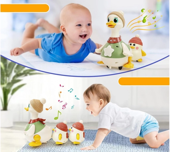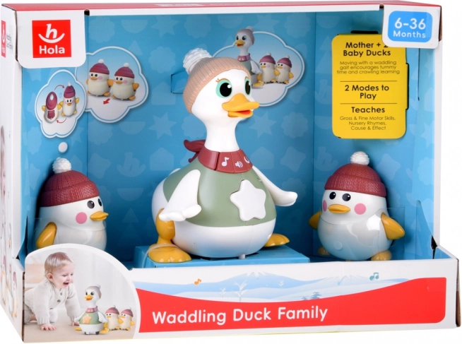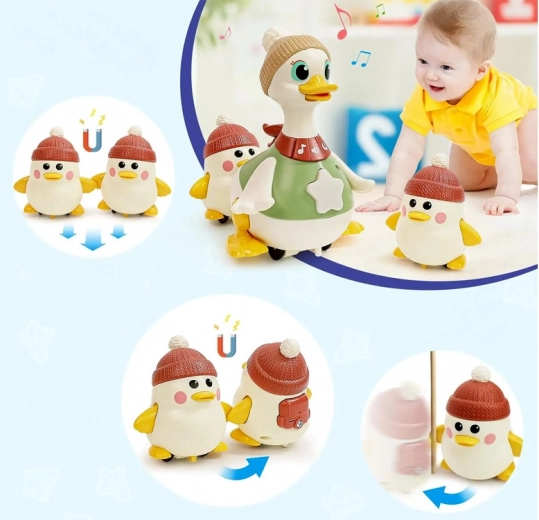 Prisrčna račja družinica razveseli malčke od 6 mesecev naprej. Mamica raca z dvema račkama se premika na kolescih, predvaja veselje melodije, ima svetlobne učinke in premični kljunček. Zahvaljujoč magnetni povezavi rački sledita mamici in tvorita vlakec, ki otroke motivira k ropotanju, plazenju in prvim korakom.