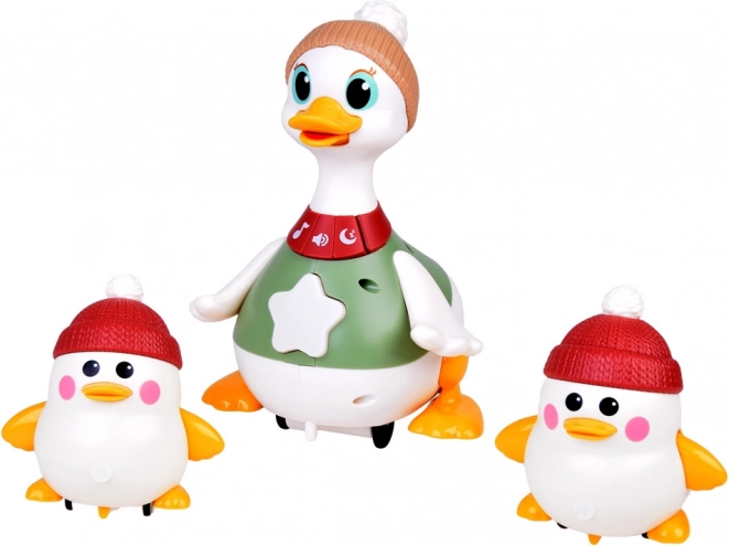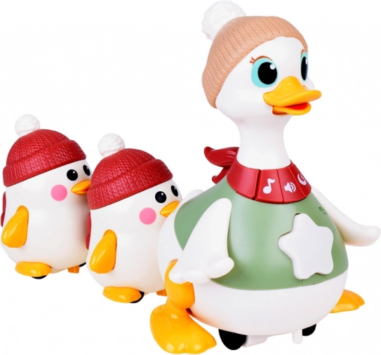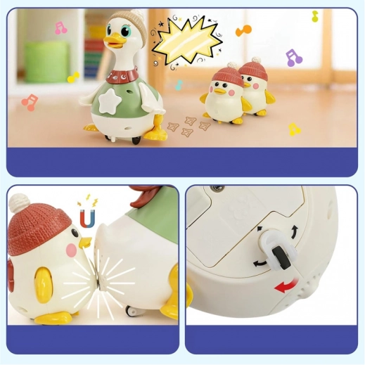 Mamica raca predvaja vesele melodije, ima gumb z uspavankami, nastavljivo glasnost in nežno svetlečo zvezdico na trebuščku. Kljunček se med petjem premika.