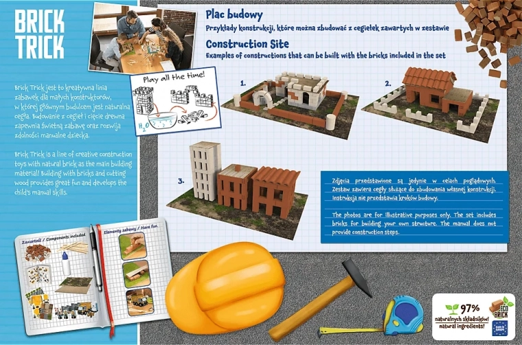 Postanite graditelj in korak za korakom zgradite realistično gradbišče iz naravnih glinenih opek. Vsako opeko položite kot v resnici, deščice lahko režete na mero, z v vodi topnim lepilom pa je mogoče model kadarkoli razstaviti in začeti znova. Končano gradnjo oživite s priloženimi dekoracijami in papirnatimi figuricami.