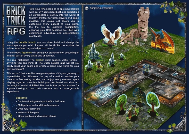 Odkrijte gradbeni set Trefl Brick Trick RPG: pozabljena dediščina, ki povezuje RPG pustolovščine z pravimi opekami in v vodi topnim lepilom za večkratno sestavljanje. Ustvarjajte gradove, razvaline, ječe in druga okolja za impresivne igralne prizore, razvijajte kreativnost, taktično razmišljanje in pripravite nepozabne kulise za vsako RPG kampanjo.