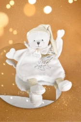 Ta nežna plišasta ninica v obliki medvedka je zasnovana tako, da spremlja vašega malčka že od prvih dni. Žameten material, prijeten na dotik, spodbuja čute, medtem ko je lahka in varna zasnova enostavna za držanje z malimi rokicami. Elegantni detajli, kot so bež kapica, bel ovratnik in siva vezenina logotipa, dajejo igrački brezčasen videz.