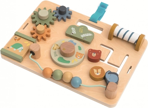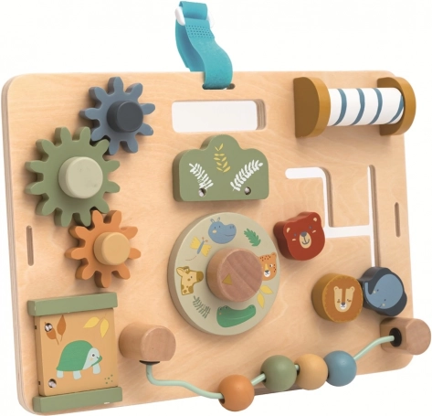 Odkrijte zabavno in poučno igračo za najmlajše: aktivno desko v nežnih pastelnih barvah z živalmi s safarija. Ponuja kroglični labirint, zobata kolesca, vrtilne in drsne ploščice ter druge elemente, ki razvijajo fino motoriko, koordinacijo roka–oko in radovednost. Zahvaljujoč priročnemu izrezu se zlahka prenaša, pašček pa omogoča preprosto obešanje.