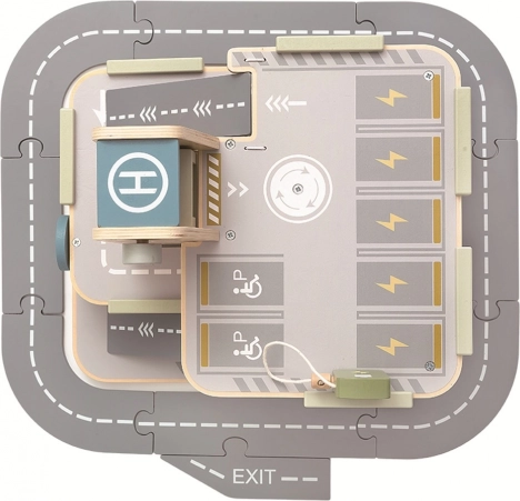 V paketu najdete vse potrebno za takojšnjo igro – štiri avtomobilčke, helikopter, tri prometne znake, avtopralnico in dve bencinski stojali, od katerih eno služi kot polnilnica za električna vozila. Varna lesena izdelava in trpežna konstrukcija zagotavljata dolgo življenjsko dobo tudi pri vsakodnevni igri.
