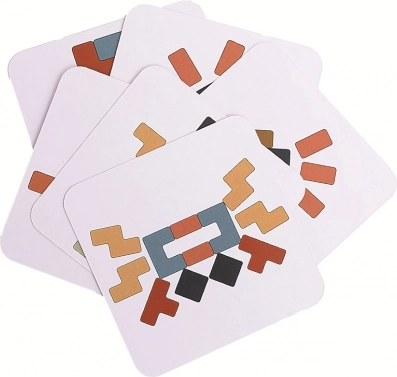 Komplet trdnih kartic z barvnimi vzorci otroke korak za korakom vodi do rešitev. Odlično za razvoj prostorske predstavljivosti in načrtovanja.