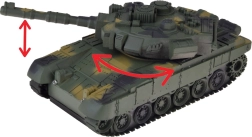 RC tank v zeleni kamuflaži verno posnema pravo vojaško tehniko in ponuja gladko vožnjo naprej/nazaj, vrtenje na mestu ter ročno vrtenje kupole za 360° z spremljevalnim mehanskim zvokom. Svetlobni efekti in realistični zvoki streljanja še okrepijo vzdušje bitk doma in na prostem.