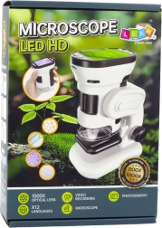 - digitalni mikroskop z zaslonom HD, stojalo in osnova, 32 GB microSD, vrvica za vrat, 4 prazna stekelca, vzorčni živalski preparat, vzorčni rastlinski preparat, USB kabel, lopatka za vzorce, kaveljček, rezilni nož, pinceta