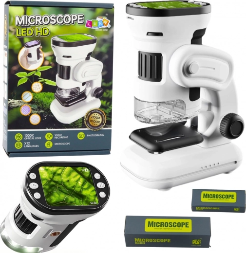 Odkrijte mikrosvet z digitalnim otroškim mikroskopom z zaslonom HD in zveznim povečavo 200×–1000×. Vgrajeni 2,0" zaslon olajša opazovanje, zajemanje fotografij in videov ter shranjevanje na priloženo 32 GB microSD. Trije načini uporabe – ročni, na stojalu in stacionarni – ga naredijo vsestranski in mobilni učni pripomoček, napajan prek USB ali baterij AA.