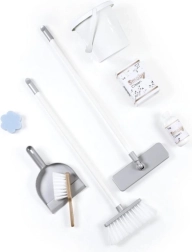 V kompletu so lopatka in metlica, mop, krtača, vedro ter makete čistilnih sredstev – vse za igro vlog in razvoj fine motorike.