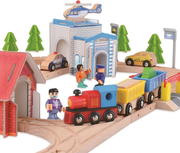Ta natančno zasnovana vlakovna proga ponuja popoln svet na tirih: lokomotivo z vagoni, avtomobile, figurice, policijsko postajo, heliport, drevesa in prometno signalizacijo. Otroci lahko naložijo tovor, se zapeljejo čez dvignjen most, ustavijo pri postaji in varno prečkajo železniški prehod z zapornicami. Vsaka vožnja se spremeni v novo zgodbo ter razvija logiko, koordinacijo oko–roka in komunikacijo pri skupni igri.