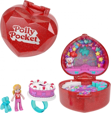 Proslavite 80. obletnico podjetja Mattel s čarobnim kompletom Polly Pocket v rubinasto rdečem srčku! V notranjosti vas čaka mini prizor zabave z mikropunčko Polly, darili in balončkastim ljubljenčkom. Priložen je tudi nastavljiv prstan z motivom torte, na katerega lahko pripnete punčko in odnesete zabavo kamor koli. Kompaktni srček je idealen za na pot, ima bleščeč dizajn in množico prikupnih detajlov za kreativno igro.