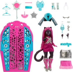 Podajte se po sledeh v Hauntlywood in odkrijte, kje se skriva Catty Noir! V paketu najdete tematski zemljevid in ključ z lupo, ki razkrije skrivne simbole. Po odprtju garderobe otroke čakajo presenečenja za odklepanje ter modni kosi, s katerimi nastanejo edinstveni videzi MONSTER HIGH.