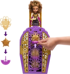 Podajte se po sledeh Clawdeen Wolf v svet Hollyducha! S ključem z lupo razkrijte simbole na zemljevidu, odklenite okrašeno omaro in odkrijte tematske dodatke z ujemajočimi se simboli. Tri najdene dele sestavite v talisman, pritrdite ga pri osnovi omare in potisnite navzgor – razkrili boste punčko Clawdeen v osupljivem videzu. Ta čarobni trenutek lahko ponavljate znova in znova.