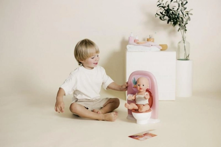 Stilski kopalni komplet za punčke iz linije Baby Nurse prinaša vse potrebno za vsakodnevno nego. V kompletu so stranišče, umivalnik z ogledalom, rolica toaletnega papirja ter dodatki, kot sta zobna ščetka in lonček. Primerno za punčke do 42 cm in izdelano iz najmanj 75 % recikliranega materiala.
