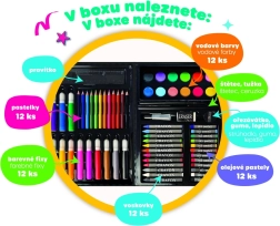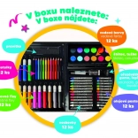 Praktičen ustvarjalni set za male umetnike v trpežnem plastičnem kovčku ponuja vse potrebno za slikanje in risanje. Odličen za doma, vrtec in na pot. Vsebuje pestro izbiro pripomočkov, ki razvijajo otroško domišljijo in fino motoriko, vključno s barvicami, flomastri in akvarelnimi barvami.