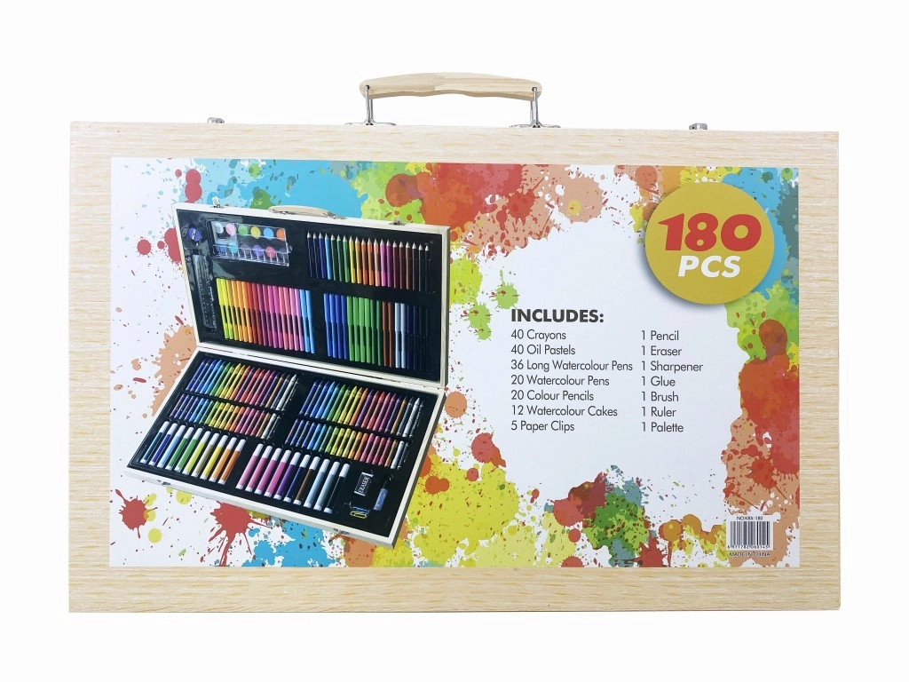 Odkrijte vsestranski leseni slikarski kovček z bogato opremo za otroke, šolarje in odrasle. Set ponuja 180 kosov likovnih pripomočkov za risanje, slikanje in ustvarjanje – vse pregledno shranjeno v praktičnem lesenem kovčku, idealno za dom, šolo in na pot.