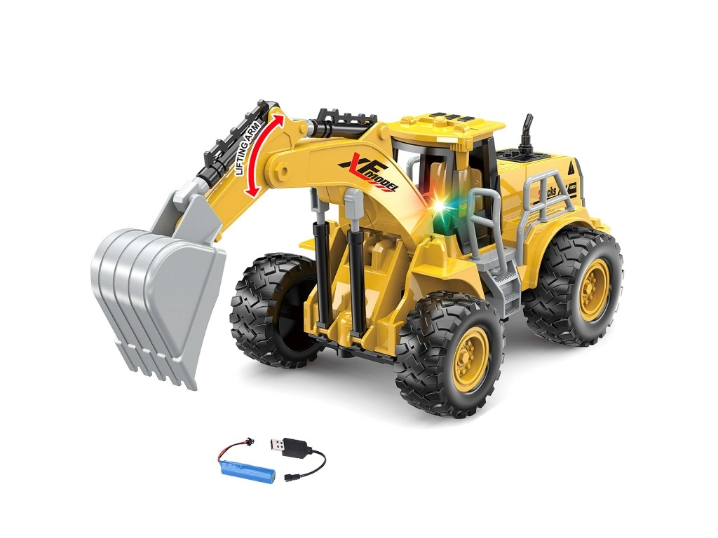 RC tovornjak je pripravljen na vožnjo – v paketu najdete polnilno baterijo 3,7 V in USB polnilni kabel. Daljinski upravljalnik zahteva 2× AA bateriji (nista priloženi). Samodejni demo način prikaže vse funkcije vozila s pritiskom enega gumba, zato je popoln tudi za začetnike.