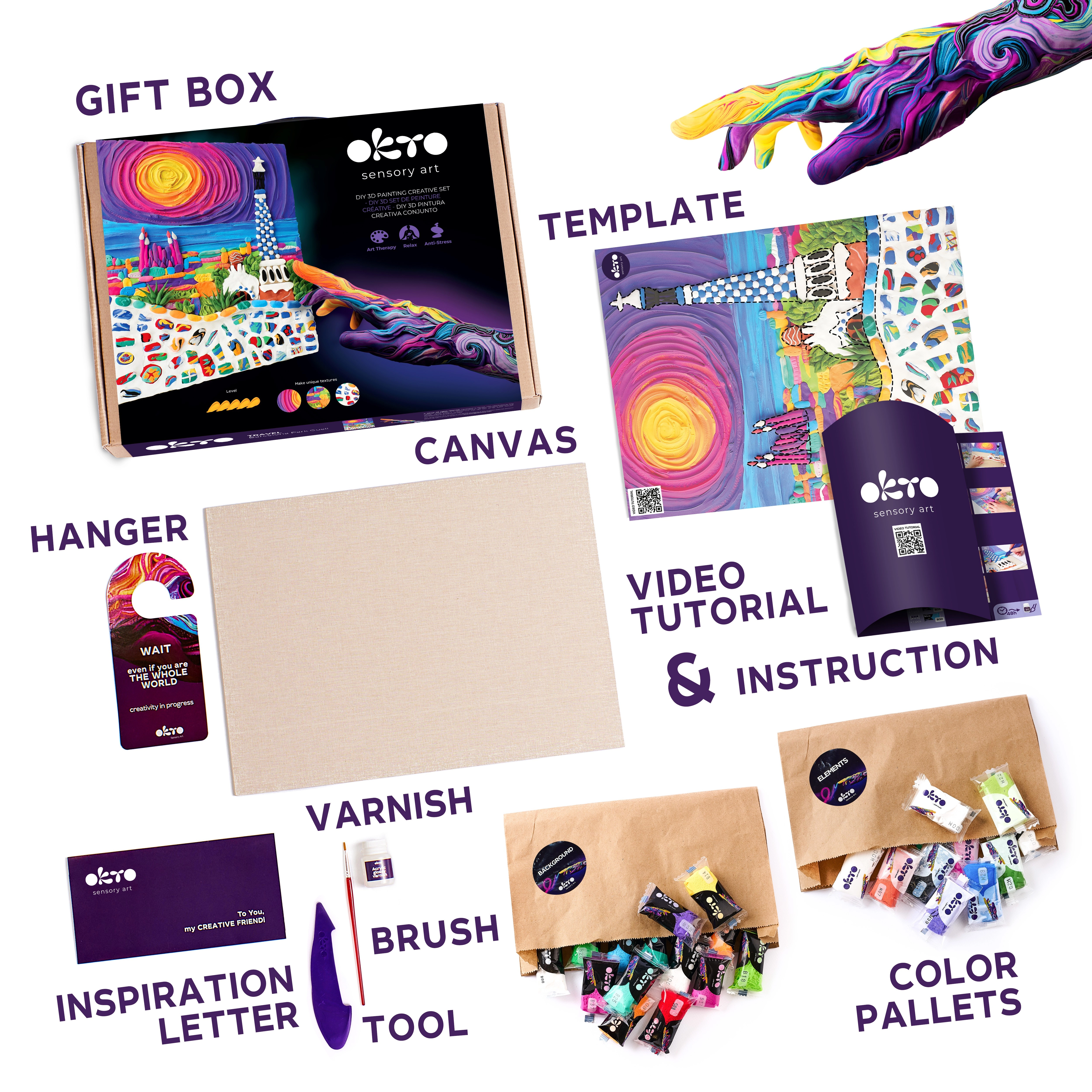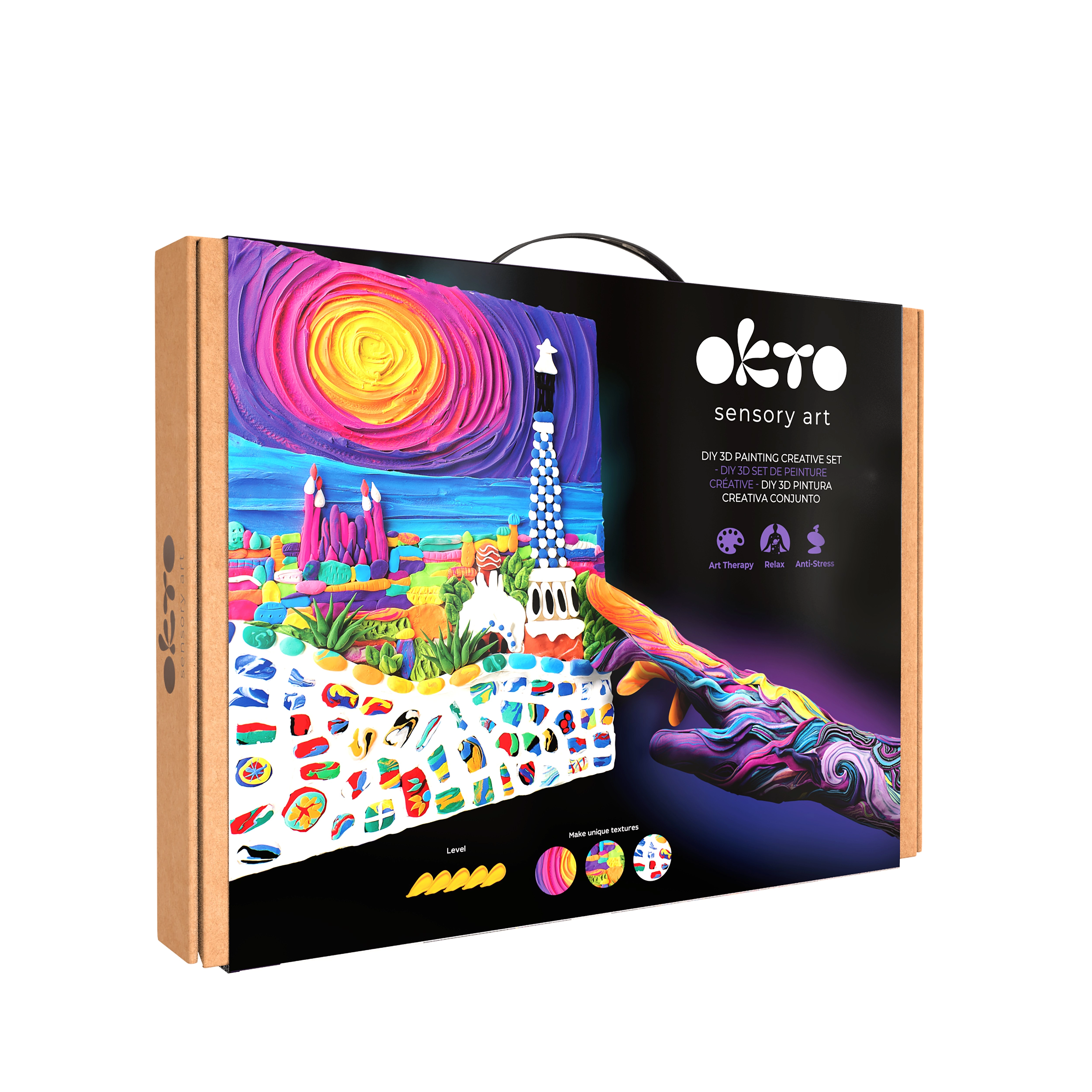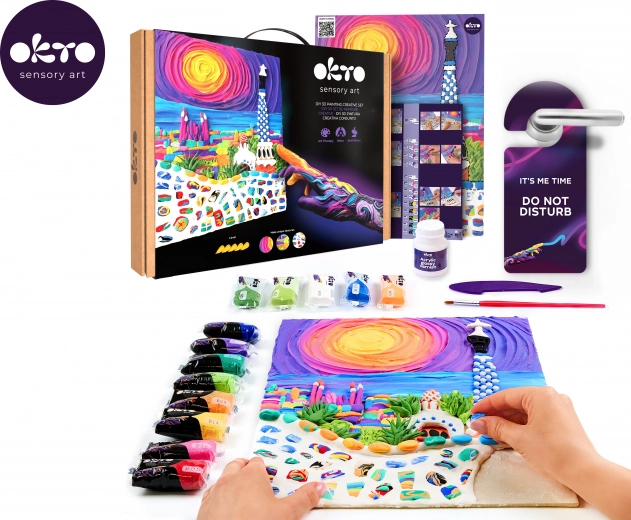 Ta vrhunski kreativni komplet OKTO vam omogoča ustvariti plastično sliko z edinstveno teksturo in igrivimi detajli, navdihnjenimi z arhitekturo Barcelone. Zahvaljujoč samostrjujoči modelirni masi dosežete izrazit 3D učinek, ki po premazu z akrilnim lakom izstopa in je dolgotrajno zaščiten.