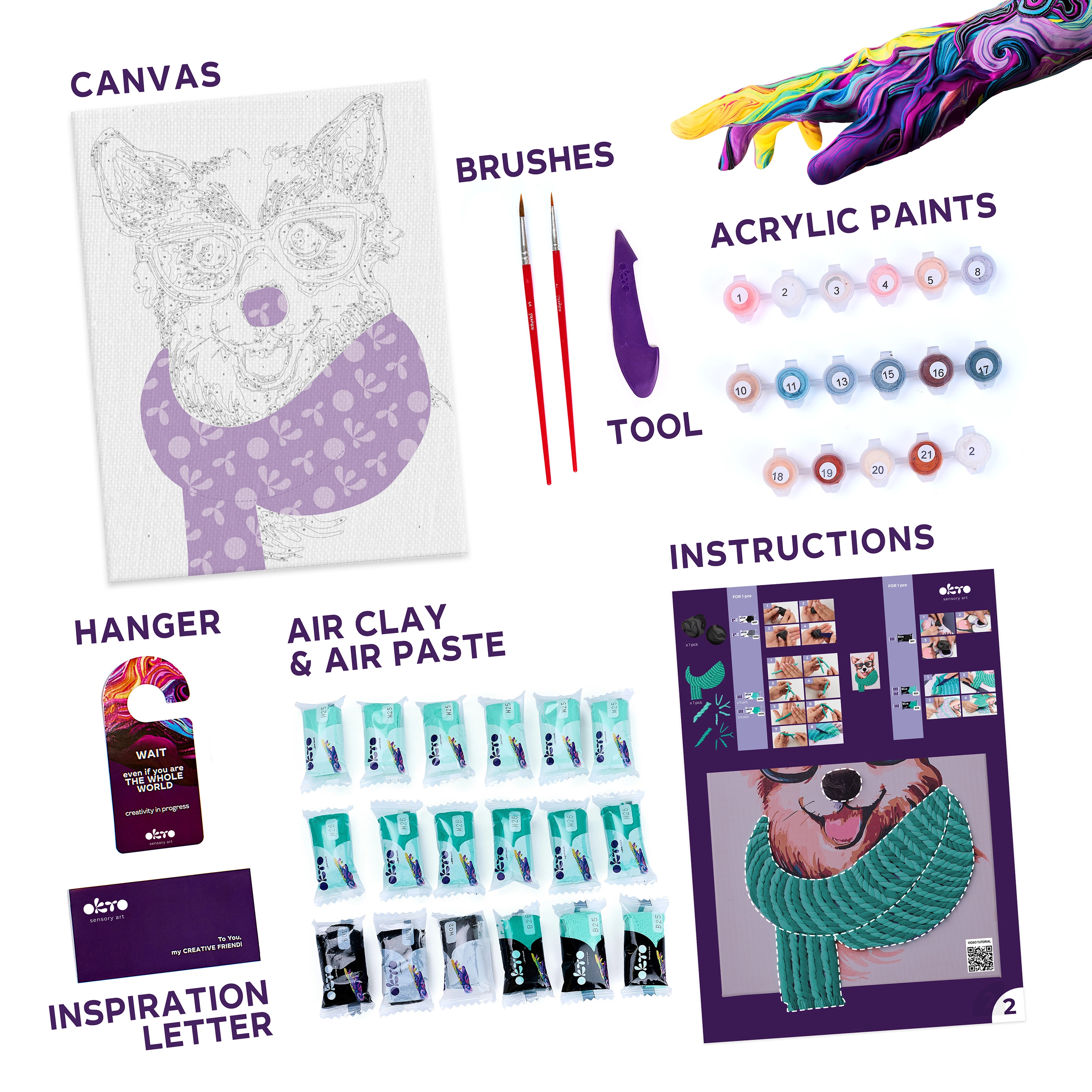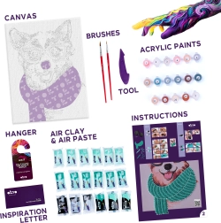 - Platno, slikovna navodila, modelirno orodje, samostrjujoča modelirna masa, set akrilnih barv, čopič