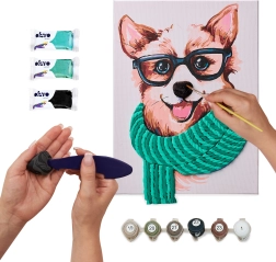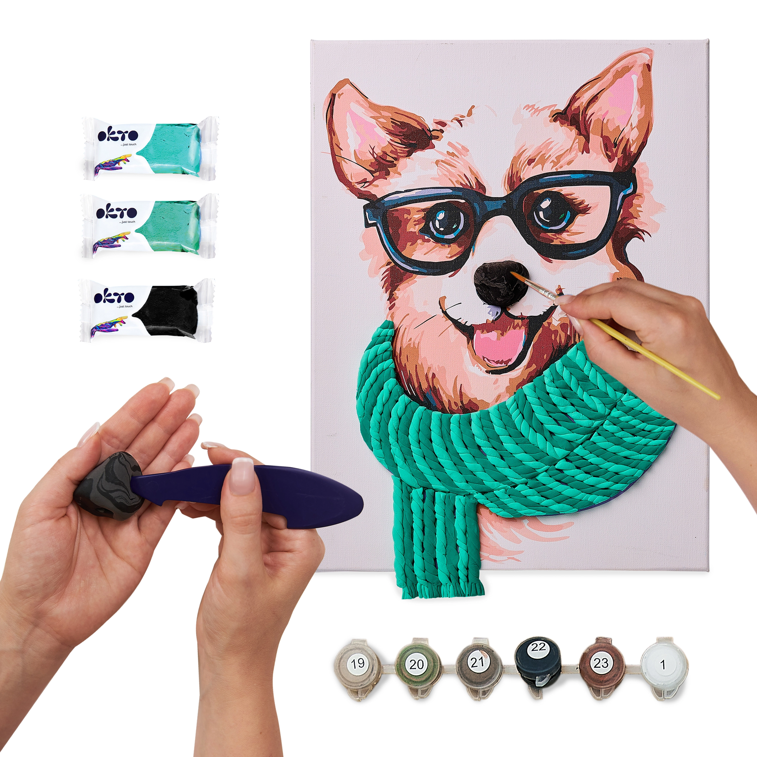 Ustvarite izvirno dekoracijo s kreativnim kompletom OKTO – slikanje po številkah in 3D modeliranje v enem. Na platnu velikosti 30 × 40 cm pobarvate trendovski motiv Fashion Corgi in s samostrjujočo maso oblikujete plastičen 3D element. Idealno za sprostitev, razvoj fine motorike ter kot darilo za ljubitelje ustvarjanja.