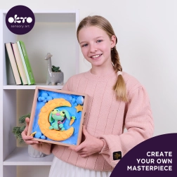 Odkrijte veselje modeliranja s kreativnim kompletom Okto. Po priloženih slikovnih navodilih boste zlahka oblikovali čudovito 3D sceno v okvirčku z motivom Zajček na luni. Zahvaljujoč samosušeči masi ne potrebujete nobene peči ali dodatne opreme – končno sliko po sušenju le premažite z akrilnim lakom za trajen in sijoč videz.
