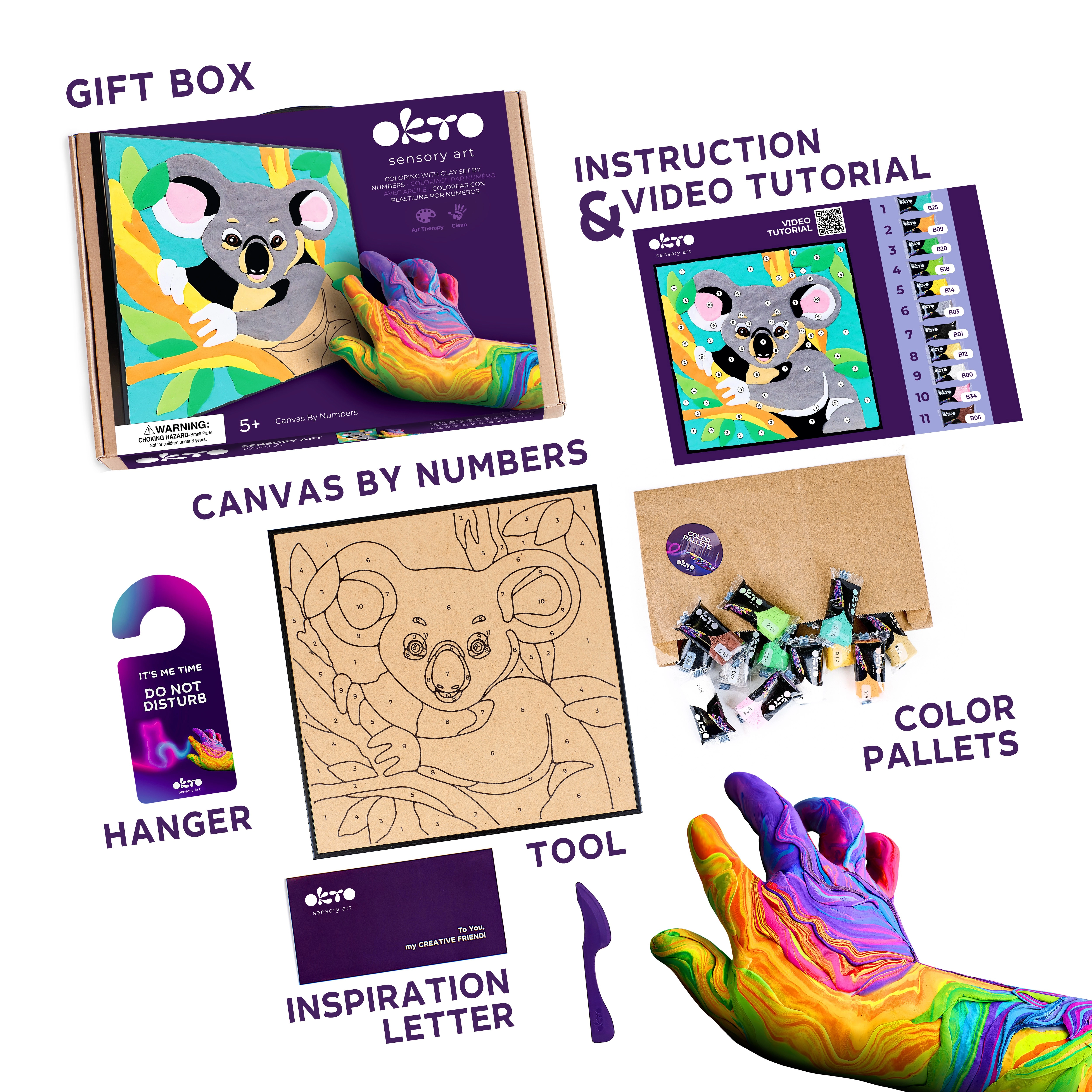 Ustvarite edinstveno 3D sliko z motivom koale. Komplet OKTO je zasnovan tako, da je delo intuitivno in zabavno – le sledite številkam in nanašajte barvno maso s priloženim modelirnim orodjem. Končni izdelek je reliefen in dekorativen, primeren za razstavo v otroški sobi ali kot prijetno darilo.
