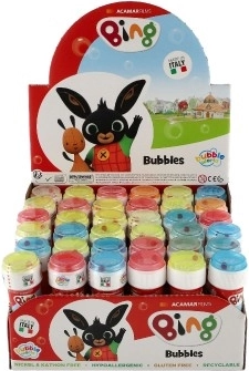 Bublifuk BING 60 ml je idealna malenkost za vsakodnevno igro, rojstnodnevne zabave in otroške zabave. Zaradi priljubljenih likov iz serije BING bo razveselil vsakega malega oboževalca. Preprosto pihanje mehurčkov spodbuja koordinacijo, ustvarjalnost in bivanje na svežem zraku.