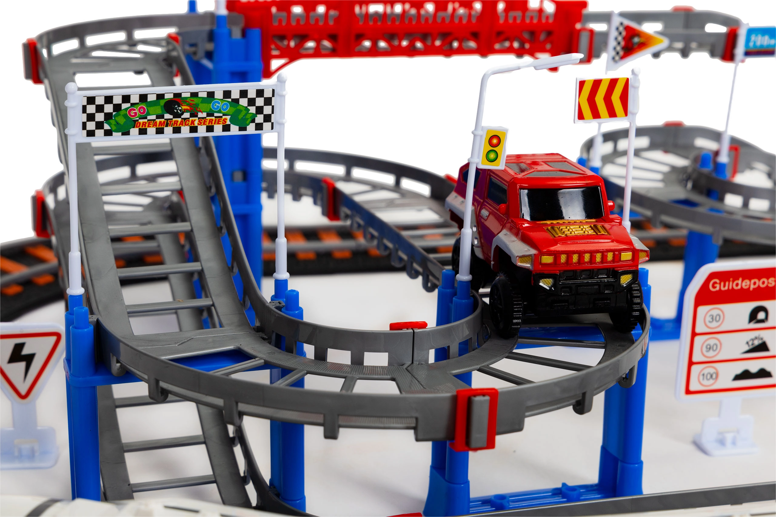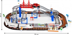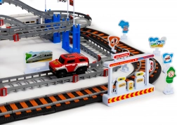 Vlak in terenski avto vozita po svojih tirih, zato lahko otroci hkrati spremljajo dve zgodbi ter preizkušajo različne trase in hitrosti.