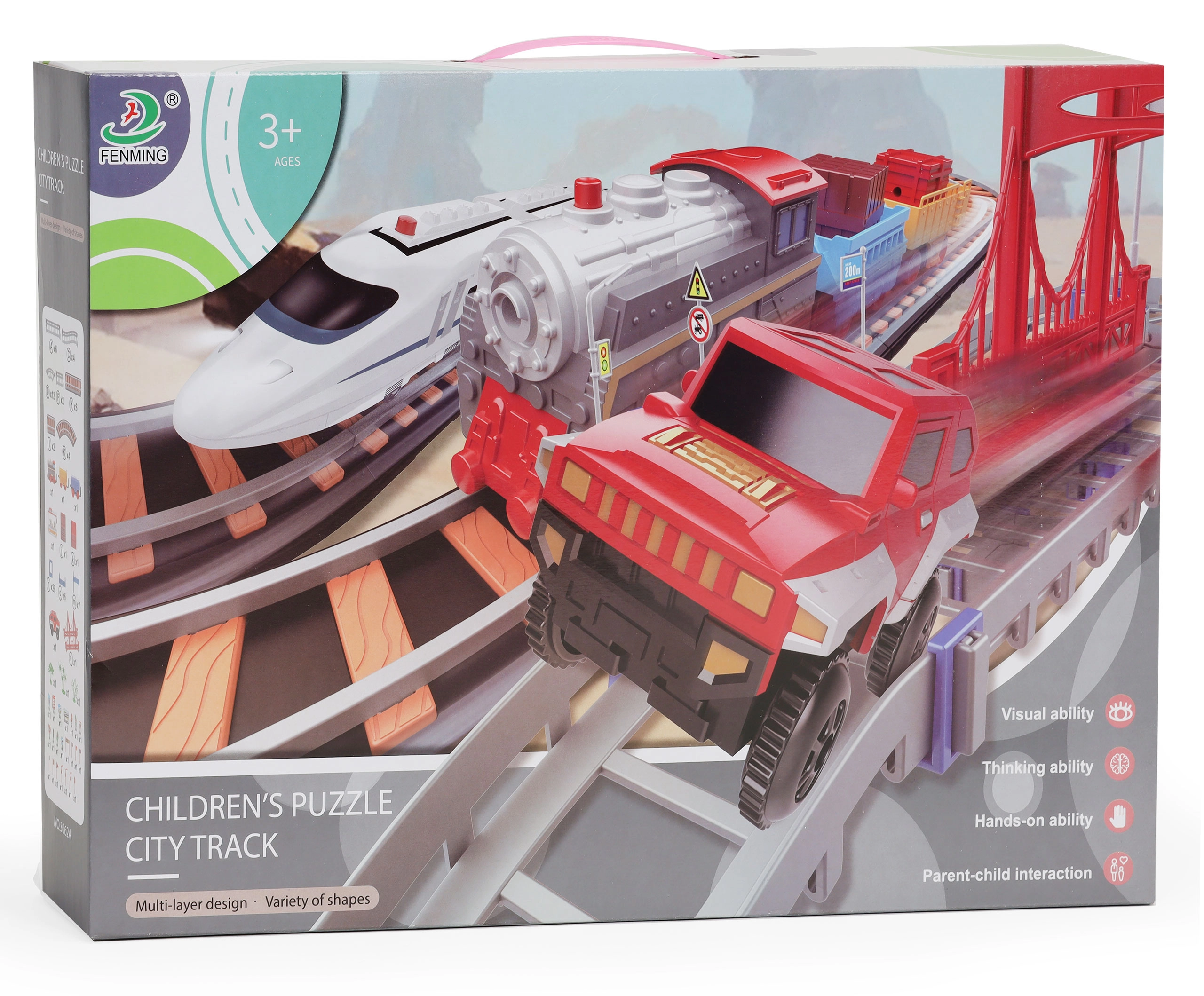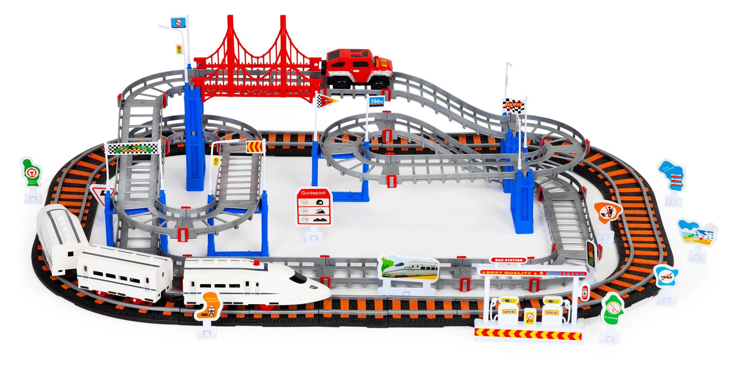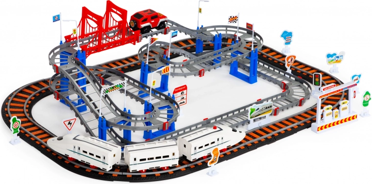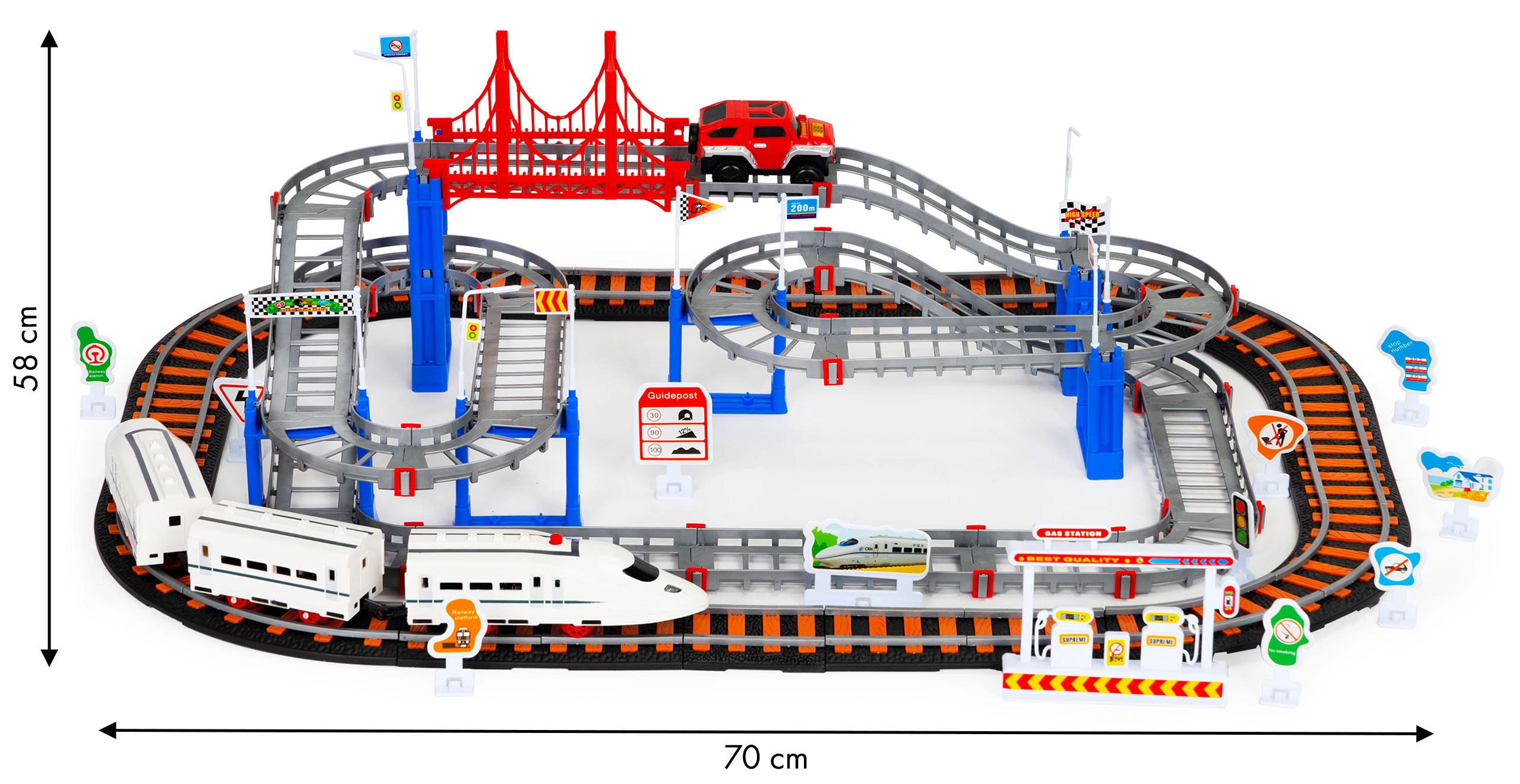 Ta celovit gradbeni komplet s 108 deli prinaša dvotirni svet za male ljubitelje vlakov in avtomobilov. Dve ločeni trasi – ena za visokohitrostni vlak s tremi vagoni in druga za terenski avtomobilček – omogočata sočasno vožnjo brez trkov. Deli se preprosto sestavljajo in trdno držijo, zato lahko otroci gradijo spirale, mostove in rampe ter vsakič pripravijo nov izziv.