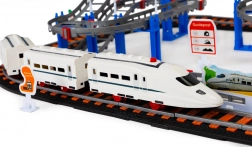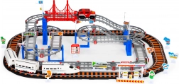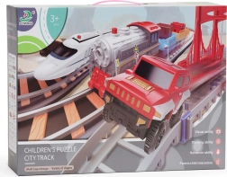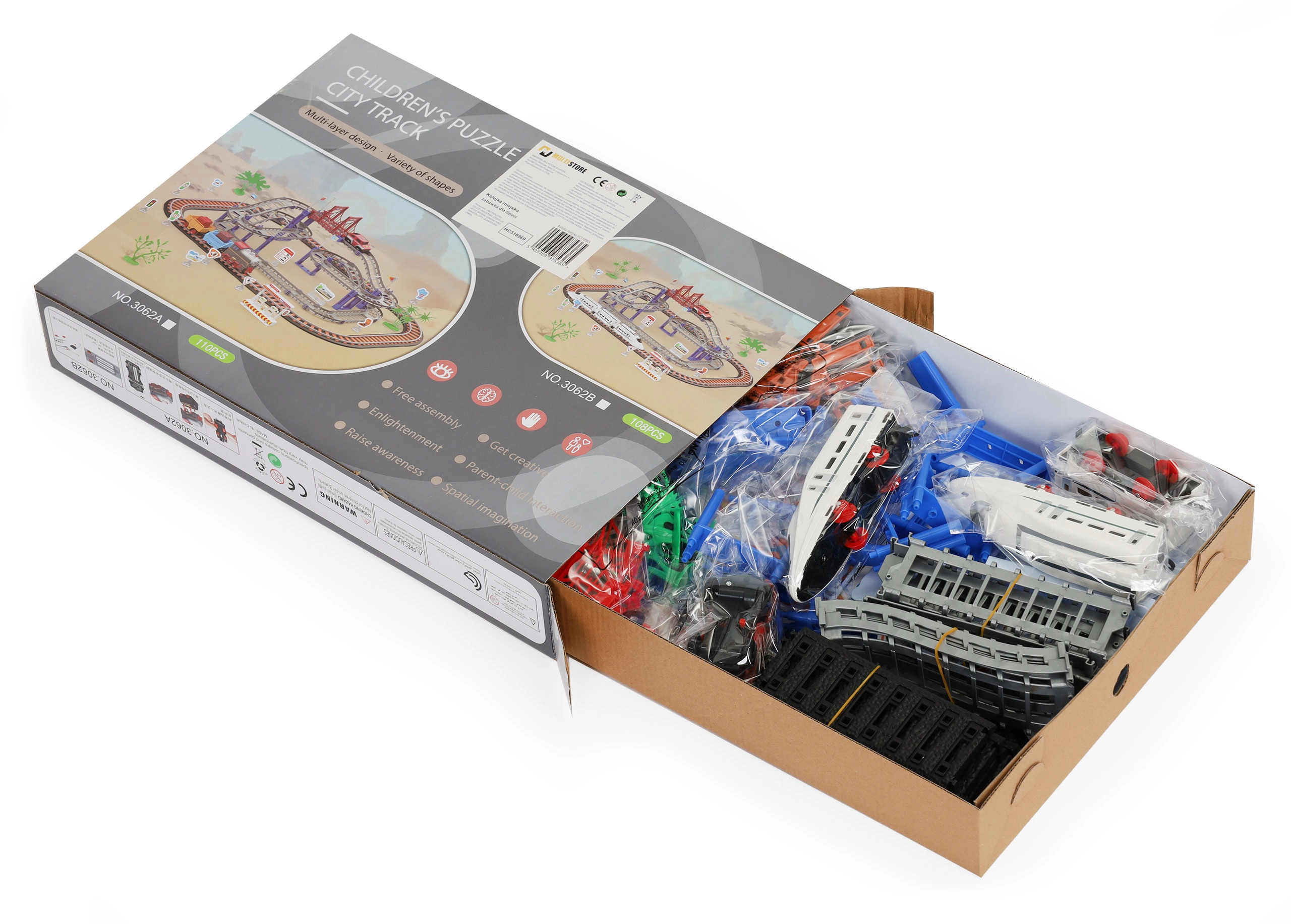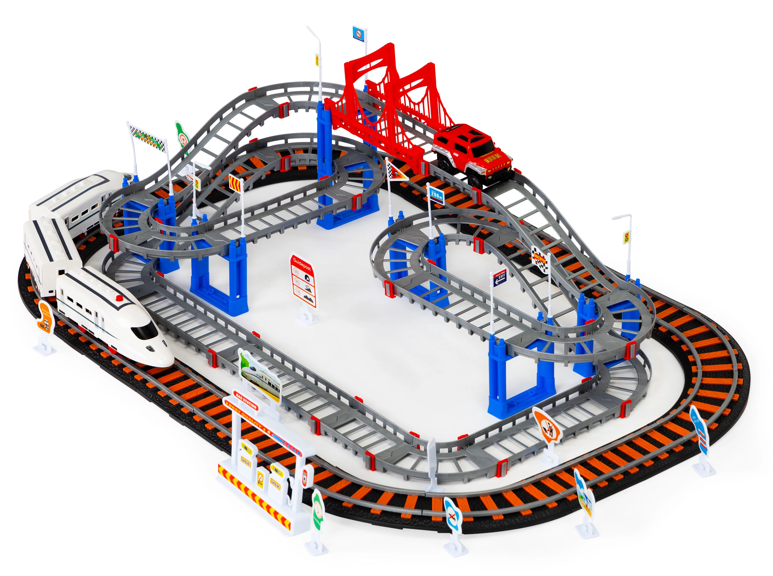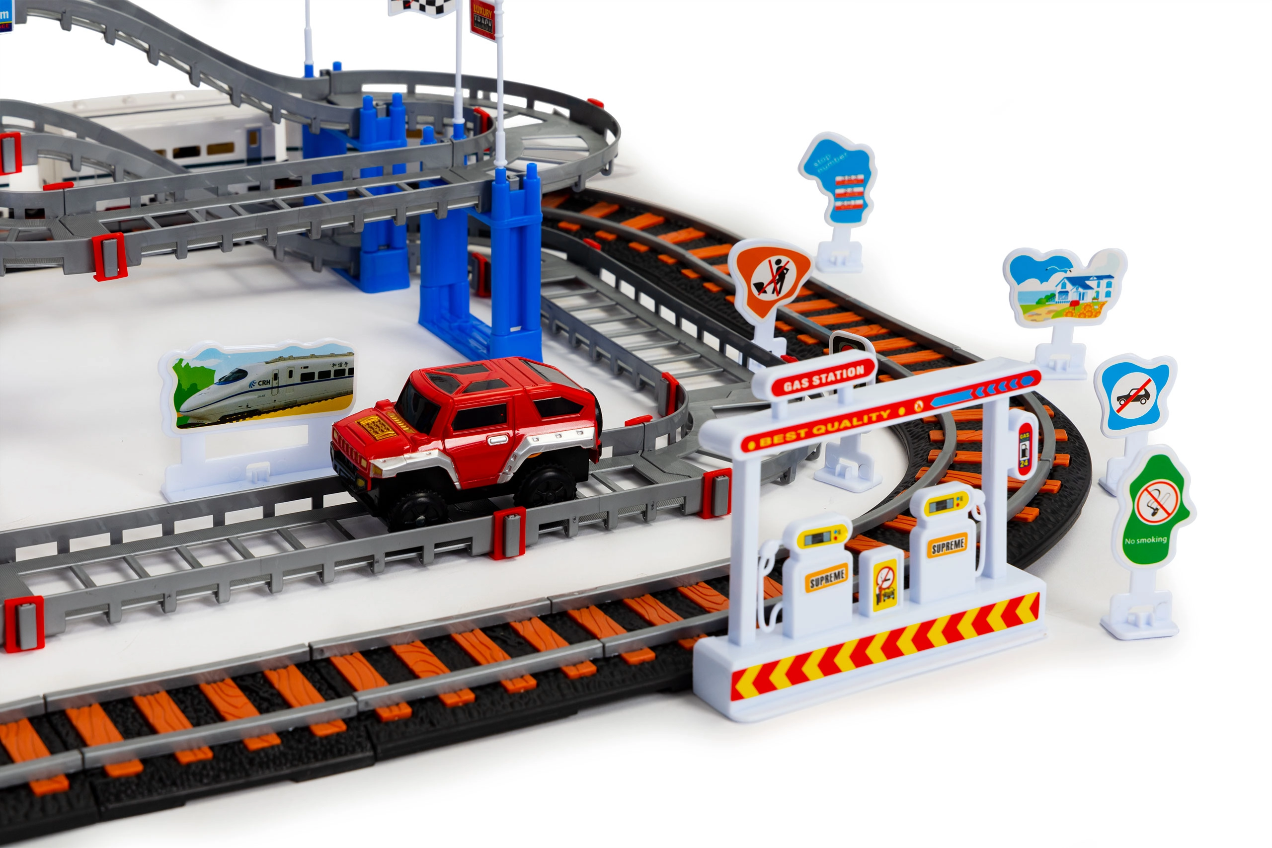 Ta celovit gradbeni komplet s 108 deli prinaša dvotirni svet za male ljubitelje vlakov in avtomobilov. Dve ločeni trasi – ena za visokohitrostni vlak s tremi vagoni in druga za terenski avtomobilček – omogočata sočasno vožnjo brez trkov. Deli se preprosto sestavljajo in trdno držijo, zato lahko otroci gradijo spirale, mostove in rampe ter vsakič pripravijo nov izziv.