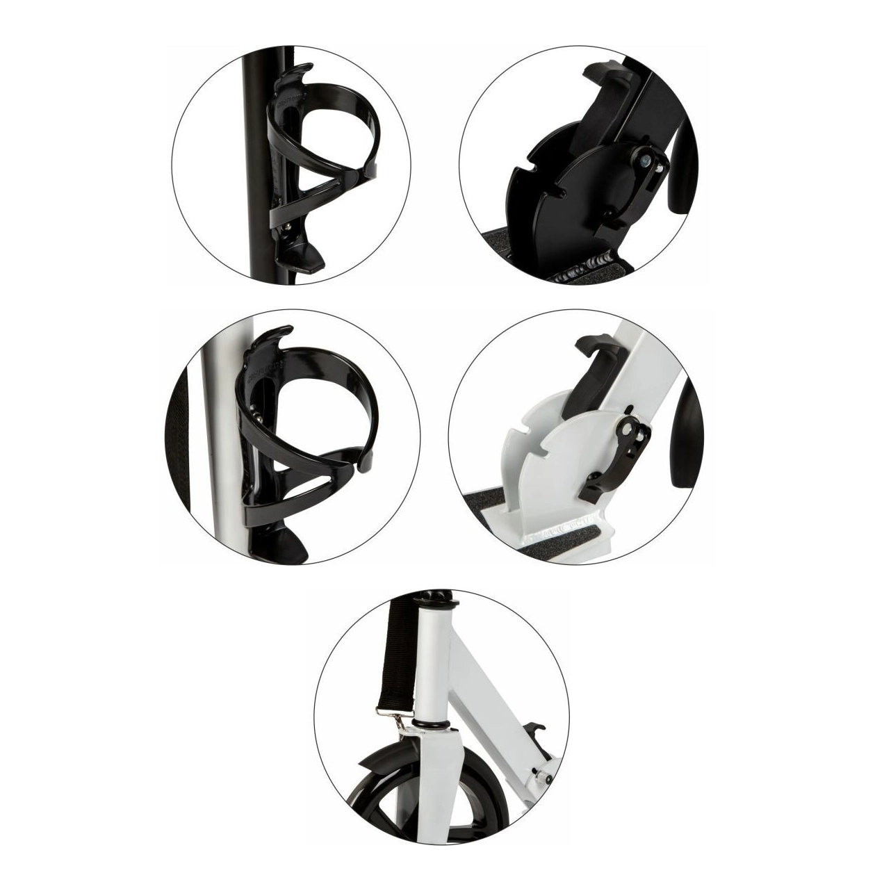 Zadnja nožna zavora z blatnikom za zanesljivo zaviranje, nedrseča deska za stabilnost, ergonomski ročaji in vgrajen nosilec za steklenico za udobje na daljših poteh.