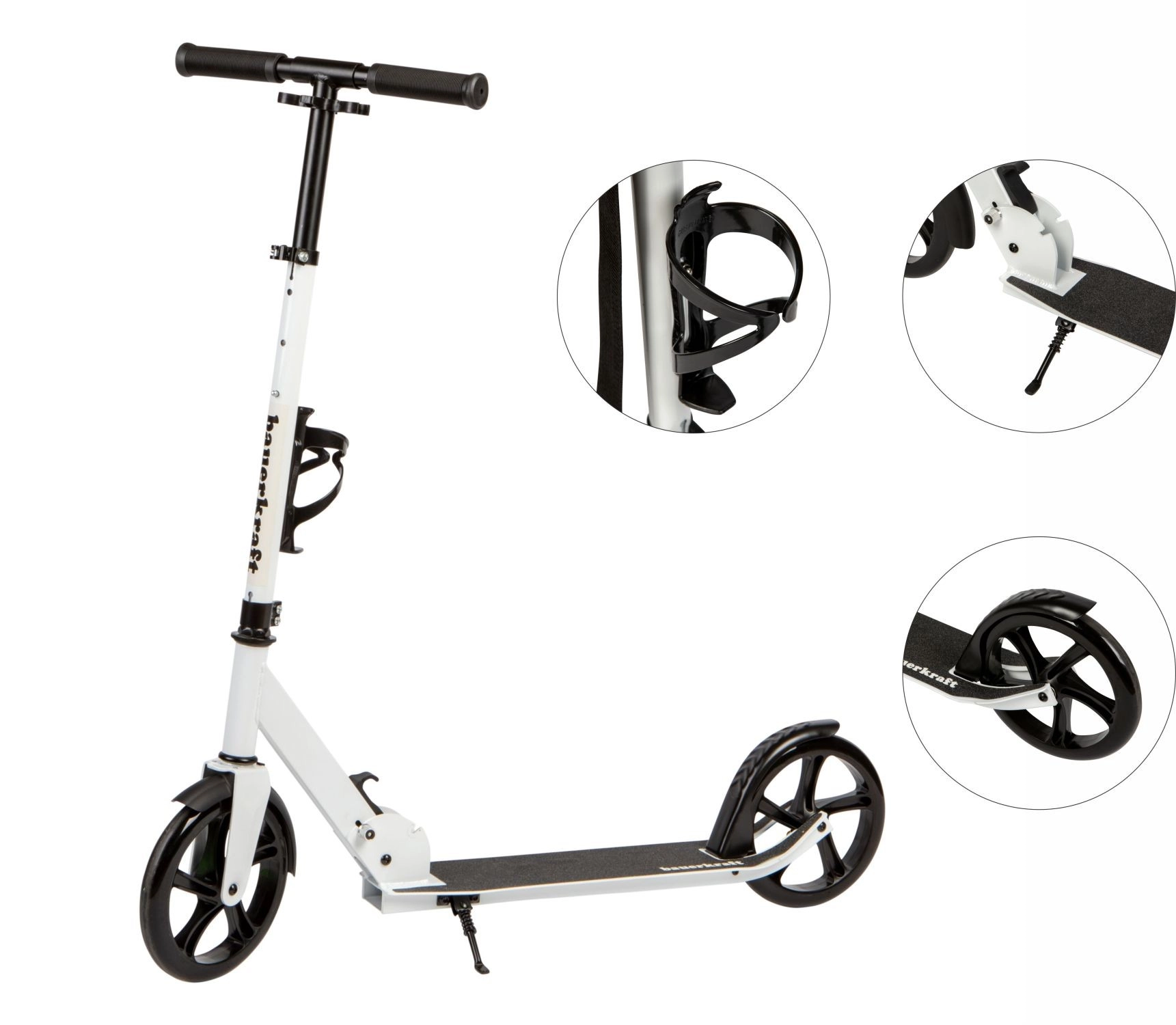 Lažna in trpežna aluminijasta konstrukcija se hitro zloži za enostavno prenašanje. Krmilo v razponu 91–101 cm se prilagodi višini otroka ali najstnika.