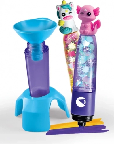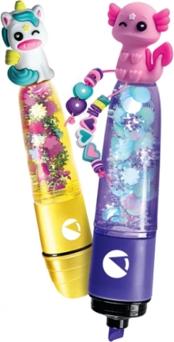 V kompletu je več barvnih črnil, prazna ohišja označevalcev, drobni okraski in pripomočki za sestavljanje. Otroci izberejo barvo, napolnijo flomaster, ga okrasijo s figuricami čarobnih živali in imajo pripravljen izviren šolski dodatek.