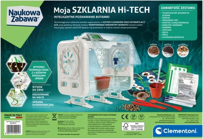 Interaktiven hi-tech rastlinjak CLEMENTONI za otroke 8+. Senzorji temperature, vlažnosti in svetlobe, LCD-zaslon, LED opozorila ter 3 načini rasti rastlin.