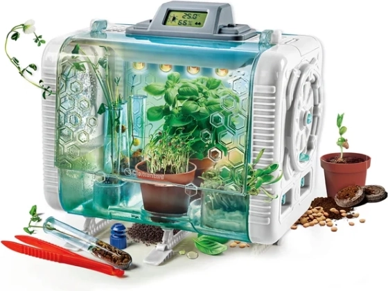Ta pametni rastlinjak združuje igro in učenje. Otroci lahko izvajajo prave botanične eksperimente, nastavijo 3 različne načine rasti in korak za korakom spoznajo, kaj rastline potrebujejo za kalitev in uspevanje. Vgrajeni senzorji neprestano merijo ključne pogoje in jih pregledno prikazujejo na LCD-zaslonu.