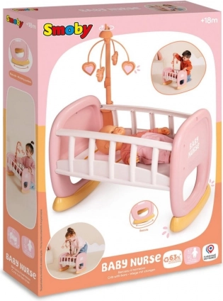Prisrčna zibelka za punčke Baby Nurse znamke Smoby združuje zibelko in posteljico v enem. Zahvaljujoč ročno vrtečemu se vrtiljaku bo vaša punčka zlahka zaspala, medtem ko stabilna konstrukcija in enostavno čistljive površine zagotavljajo udobno in varno igro. Izdelano v Franciji iz 63 % recikliranih materialov in primerno za punčke do 42 cm.