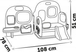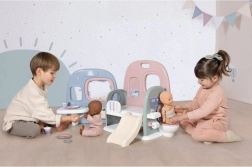 Sestavni deli vključujejo majhno kopalnico s toaletom, umivalnikom in držalom za toaletni papir, samostojen pograd s toboganom za popoldanski počitek, jedilno in ustvarjalno območje z majhno suho brisljivo tablo ter shranjevalno skrinjo za dodatke. Po igri je mogoče celoten center preprosto zložiti in ga zahvaljujoč ročaju udobno prenesti ali pospraviti.