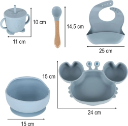 Popoln silikonski jedilni komplet za najmlajše z ljubkim krožnikom v obliki raka, skledico, lončkom z dvema pokrovoma in slamico, priborom ter nastavljivim slinčkom. Silikon brez BPA, priseski proti prevrnitvi in enostavno čiščenje naredijo ta komplet idealno izbiro za prve samostojne obroke.
