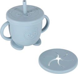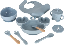 Ta 9-delni silikonski komplet pokrije vse potrebe pri obrokih: krožnik z razdelki v obliki raka za boljšo organizacijo hrane, skleda in krožnik s priseskom proti drsenju, lonček z dvema pokrovoma in slamico, varen pribor za majhne roke ter vodoodporen slinček z žepom za lovljenje drobtin.