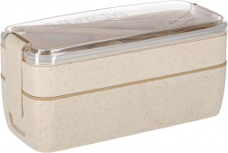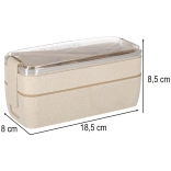- spodnja posoda, zgornja posoda, vmesni pokrov/pregrada med nivoji, drsna pregrada, pokrov s silikonskim tesnilom in dvema sponkama, 1× vilica, 1× žlička