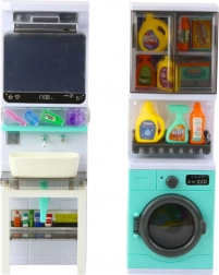 Ta podrobno zasnovan komplet domače kopalnice ponuja vse za prepričljivo igro: umivalnik z ogledalom, spredaj polnjen pralni stroj, shranjevalno omarico in bogat pribor. Ogledalo zasveti po vstavitvi baterije, pralni stroj pa oddaja svetlobne in zvočne učinke, ki podpirajo realističen doživljaj.
