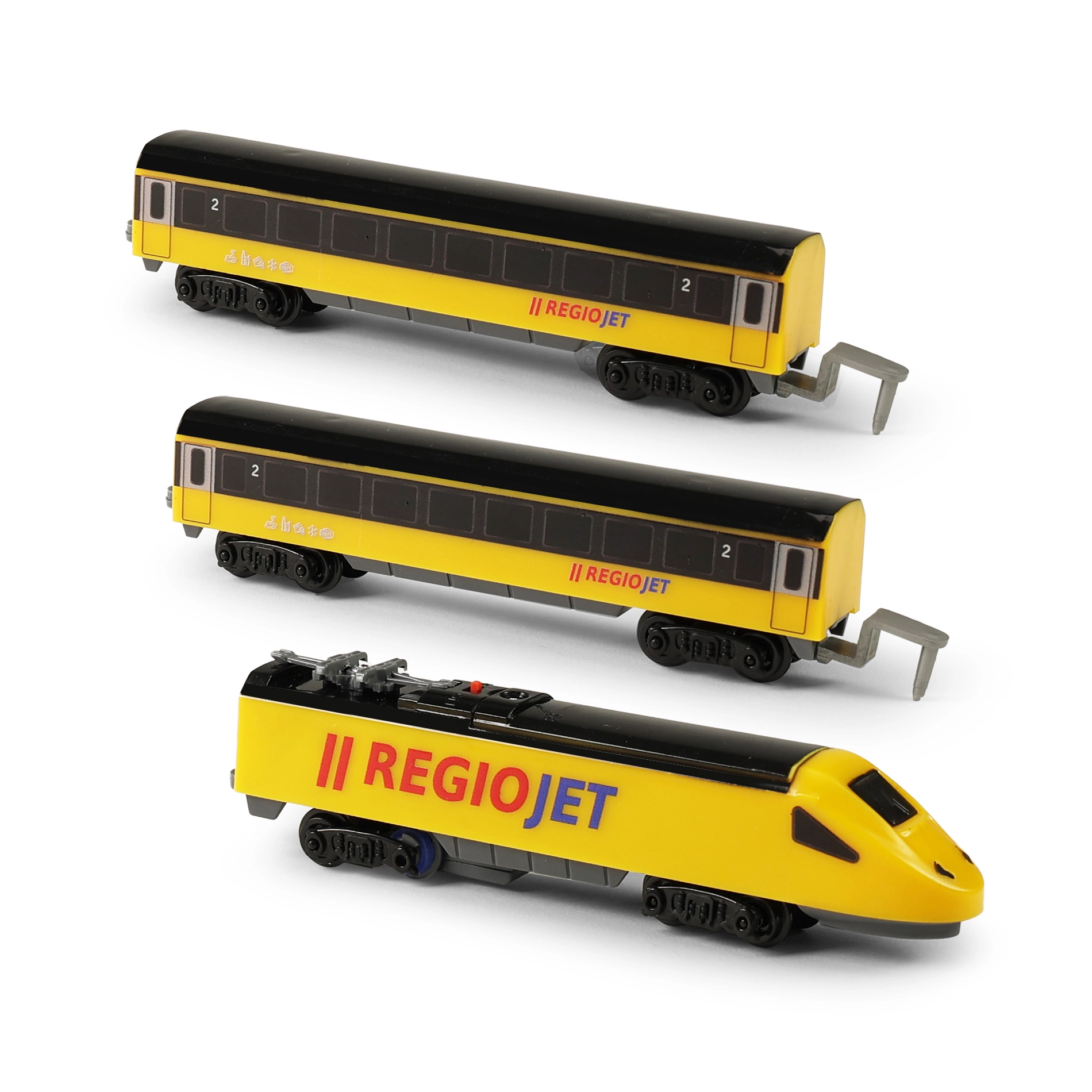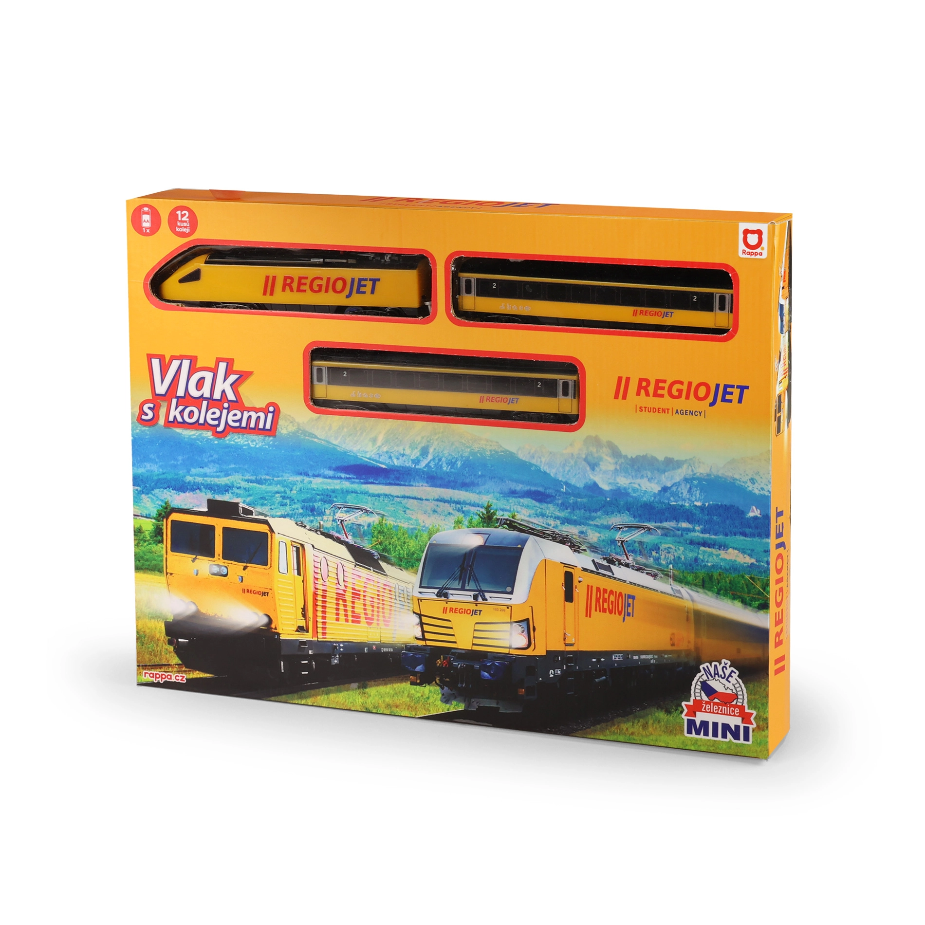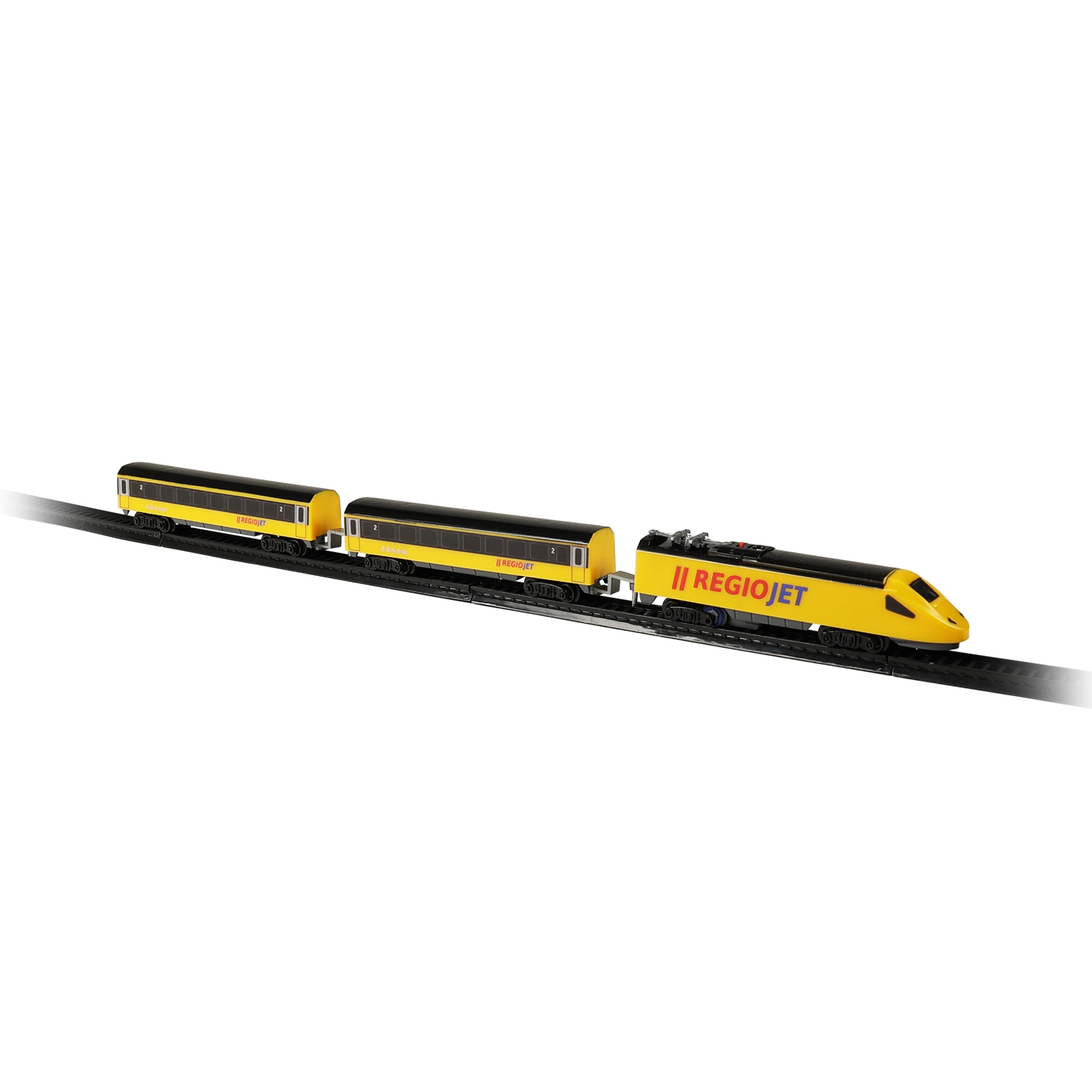 Odkrijte zabavo z vlakci s kompaktnih setom RegioJet MINI. Rumena lokomotiva z dvema vagonoma vozi po modularnem tirovju, ki ga preprosto sestavite iz 8 ukrivljenih in 4 ravnih delov. Zahvaljujoč priročnemu stikalu na strehi lokomotive je upravljanje povsem preprosto, zato se lahko otroci hitro podajo v igro.