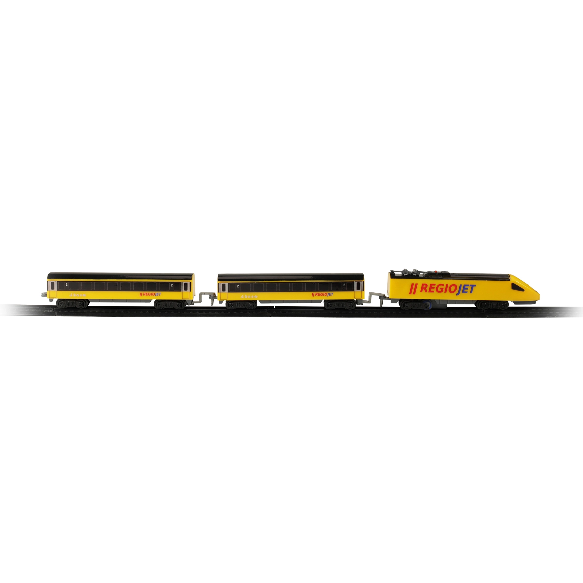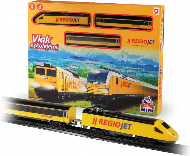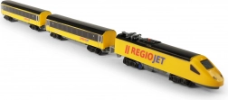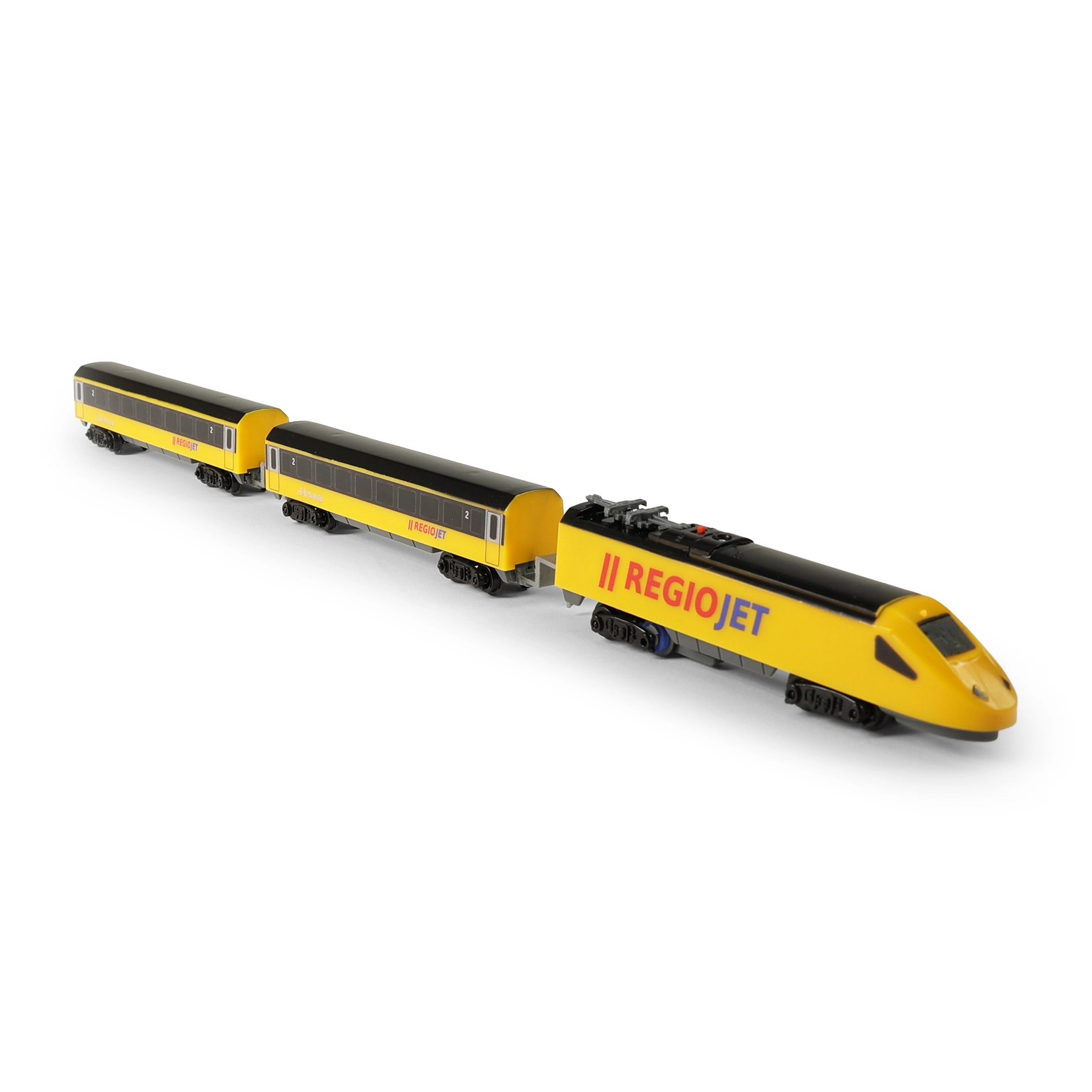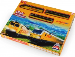 Odkrijte zabavo z vlakci s kompaktnih setom RegioJet MINI. Rumena lokomotiva z dvema vagonoma vozi po modularnem tirovju, ki ga preprosto sestavite iz 8 ukrivljenih in 4 ravnih delov. Zahvaljujoč priročnemu stikalu na strehi lokomotive je upravljanje povsem preprosto, zato se lahko otroci hitro podajo v igro.