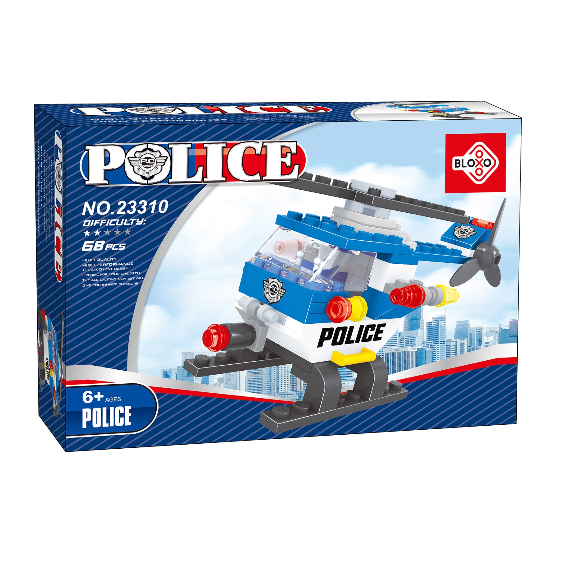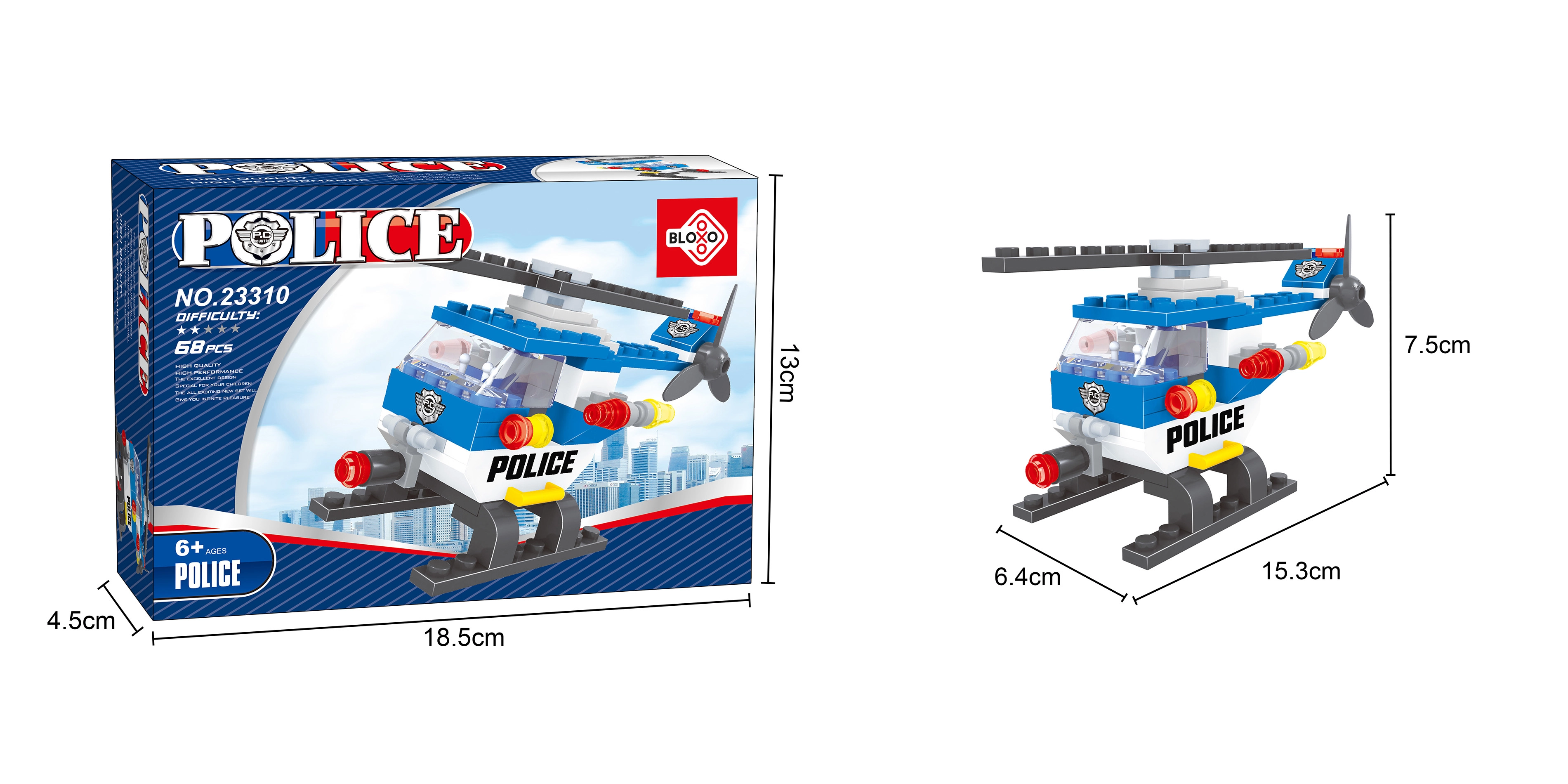 Set BLOXO Policijski helikopter otrokom ponuja zabavo in učenje v enem. Iz 68 skrbno zasnovanih delov zgradijo stajliš policijski helikopter ter se lahko podajo na napete zračne posredovalne akcije, iskanja in zasledovanja.