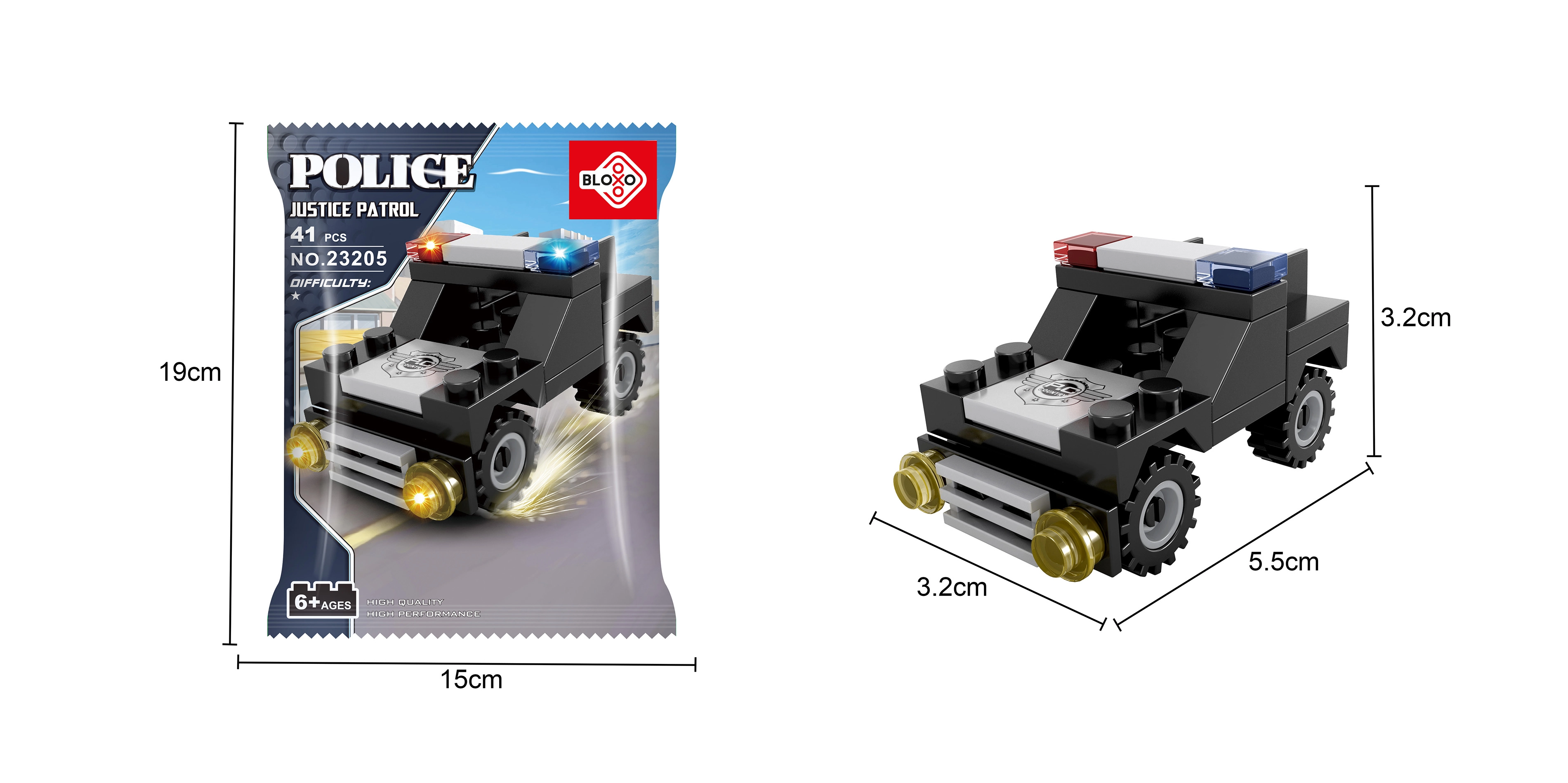 Podajte se na akcijske misije s policijskim kompletom BLOXO, ki v otroško sobo prinaša napete zgodbe in zabavo. Otroci si zlahka sestavijo svoj policijski avto in si lahko izmišljajo nove scenarije zasledovanj in reševalnih akcij.