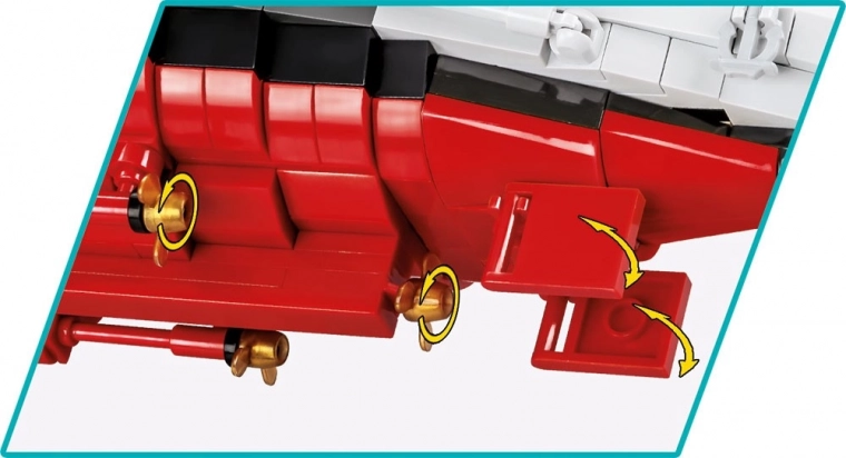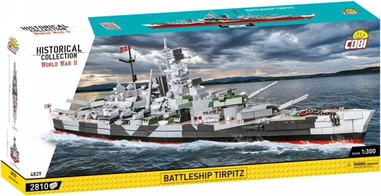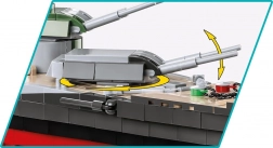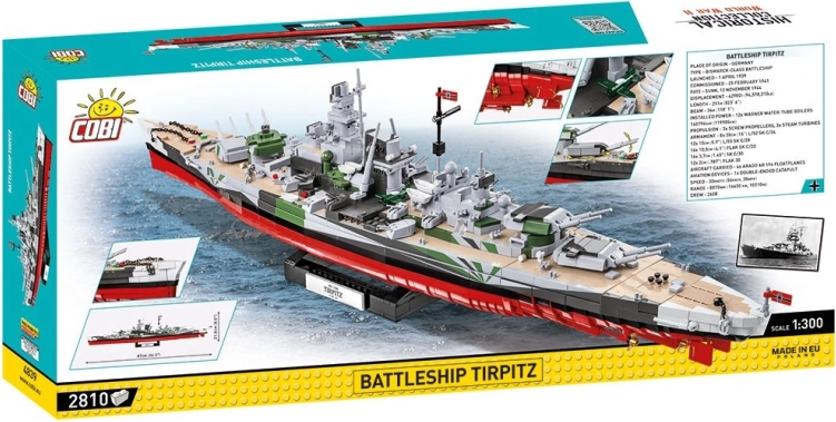 Z naprednimi tehnikami gradnje in novimi elementi se lahko veselite premičnih vijakov in krmil, vrtljivih stolpov ter dvižnih/spustnih cevi. Del kompleta je robustno črno stojalo s tiskano ploščico »Tirpitz«. Komplet ne zahteva lepljenja ali barvanja – vse sestavite zgolj iz kock COBI, ki so združljive z drugimi znamkami.
