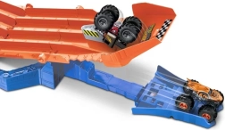 Doživite adrenalinsko dirko z Hot Wheels Monster Trucks – set Demolicijska dirka ponuja štiri vozne pasove, startni portal za sočasen start in naključno kretnico, ki odloči, kdo zapelje v cilj in kdo konča v spekatkularni nesreči. Priložena sta 2 tovornjaka v merilu 1:64 (Mega‑Wrex in Tiger Shark) ter možnost razširitve z dodatnimi avtomobili in progami.