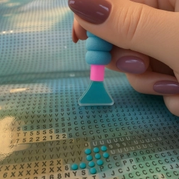 Rebrast pladenj, aplikator in vosek omogočajo natančen zajem in namestitev kamenčkov na prava mesta glede na simbole na platnu.